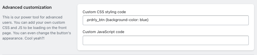 You can add this snippets in Custom CSS styling code under Advanced customization..prdrly_btn {background-color: blue}
